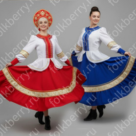 Костюм  выполнен из габардина и красиво подобранного декора в золотистых цветах. Достоинства габардина  в том, что он не мнется, не блестит, как атлас, ложится красивыми  мягкими складками, цвет не выгорает. Юбка  с оборкой, декор в золотистых цветах, по талии на  двойной резинке. Блуза  белого праздничного цвета, с баской,  рукава расширены внизу, с манжетами.   Сзади на блузе шнуровка. Она дает хорошую посадку по фигуре. Костюм предназначен для творческих  сольных и коллективных театральных выступлений.
