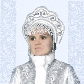 Красивый карнавальный костюм может создать образ Снегурочки, или Снежной королевы, или Зимушки в зависимости от пожеланий его обладательницы. Шубка выполненная из белой парчи с серебристым мерцающим узором (напоминающим ледяные узоры на окнах зимой), украшенная белым искусственным мехом и тесьмой с люрексом. Удобный и универсальный фасон, с регулируемой кулиской по талии, потайной застежкой, расклешеными рукавами.