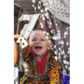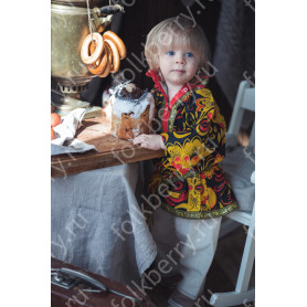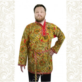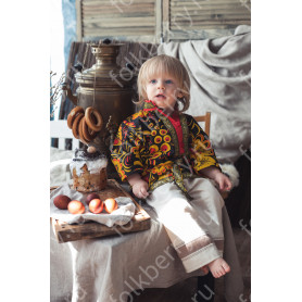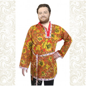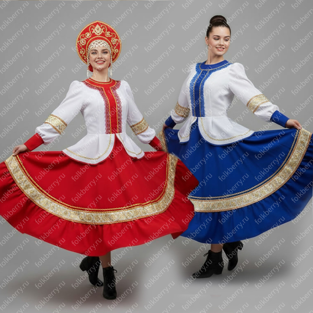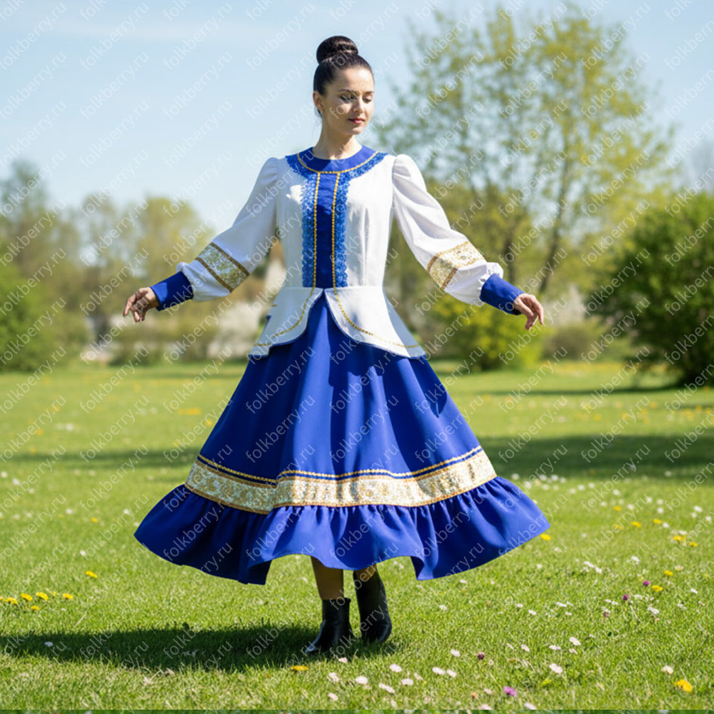 Костюм  выполнен из габардина и красиво подобранного декора в золотистых цветах. Достоинства габардина  в том, что он не мнется, не блестит, как атлас, ложится красивыми  мягкими складками, цвет не выгорает. Юбка  с оборкой, декор в золотистых цветах, по талии на  двойной резинке. Блуза  белого праздничного цвета, с баской,  рукава расширены внизу, с манжетами.   Сзади на блузе шнуровка. Она дает хорошую посадку по фигуре. Костюм предназначен для творческих  сольных и коллективных театральных выступлений.