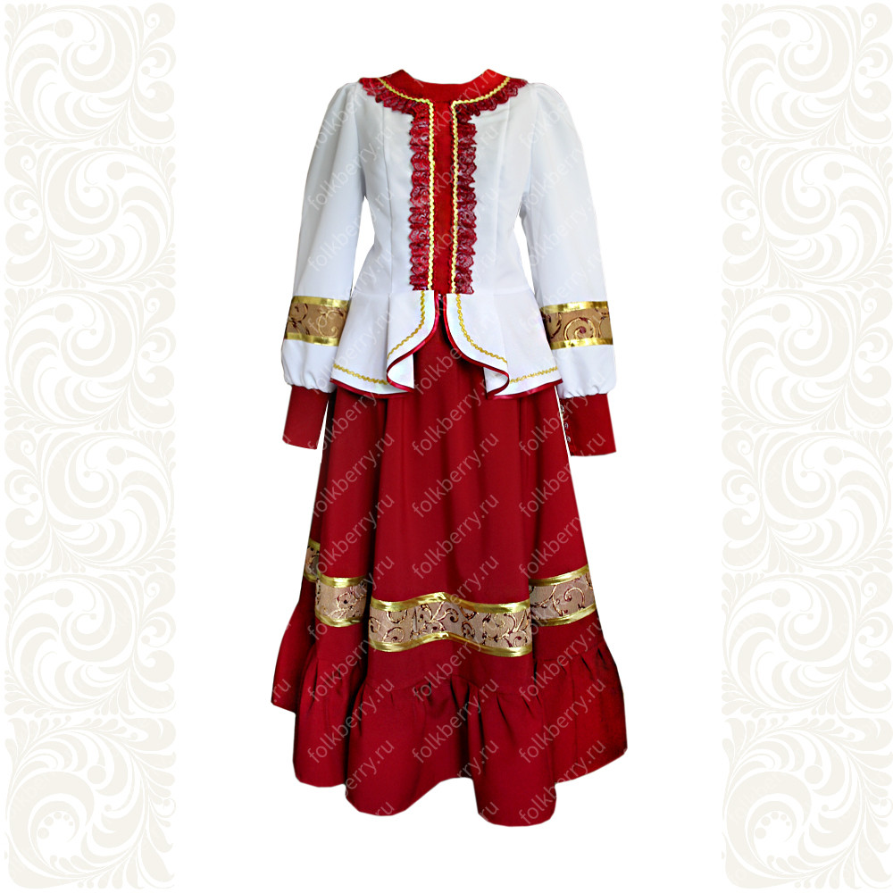 Костюм выполнен из габардина и красиво подобранного декора в золотистых цветах. Достоинства габардина в том, что он не мнется, не блестит, как атлас, ложится красивыми мягкими складками, цвет не выгорает. Юбка с оборкой, декор в золотистых цветах, по талии на двойной резинке. Блуза белого праздничного цвета, с баской, рукава расширены внизу, с манжетами. Сзади на блузе шнуровка. Она дает хорошую посадку по фигуре. Костюм предназначен для творческих сольных и коллективных театральных выступлений.