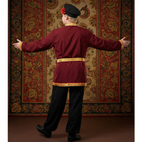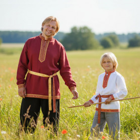 Рубаха мужская с капюшоном - ценный символический подарок мальчику или мужчине. Косоворотка "Оберег" сшита в традициях русской культуры и украшена декором из славянских знаков благополучия, процветания, здоровья, силы и удачи. Красный цвет декора также имеет символическое значение. В комплект входит пояс-кушак.