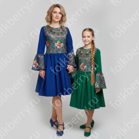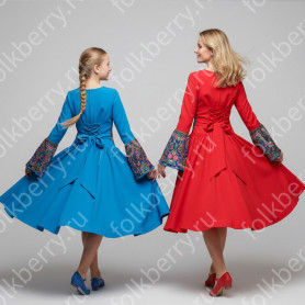 Платье «Дмитра» - современное прочтение славянских традиций. Платье четкого силуэта, чуть ниже колена, чистого яркого цвета. Платье отрезное по талии, длинный рукав-реглан, регулируемая горловина, юбка "почти солнце", с поясом. Для платья подобран эффектный декор -  солярные славянские знаки.  Платье сшито из габардина, ткани, которая не блестит и не мнется, всегда выглядит аккуратно, ярко, празднично, романтично.