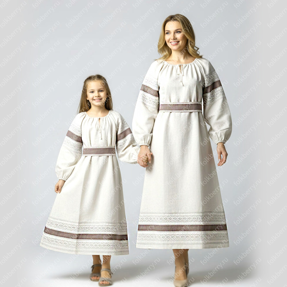 Платье "Вологда" выполнено из льняной ткани, декорировано натуральным кружевом и машинной вышивкой.