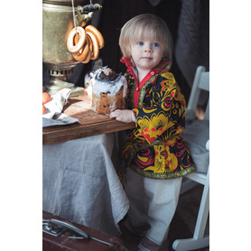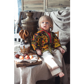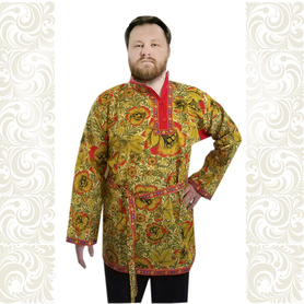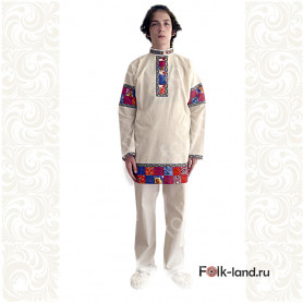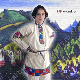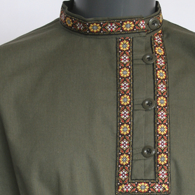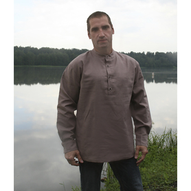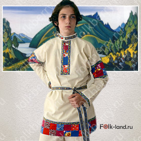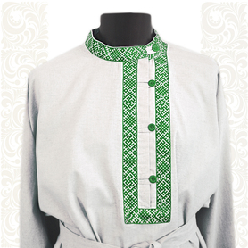 Мужская рубаха «Истоки» выполнена в свободном крое, подходящим любой фигуре. Сшита из льняной ткани. Модель имеет втачной, короткий рукав, ворот с завязками, с поясом (кушаком) из ткани с тесьмой. По низу, вороту, рукавам изделия декор из жаккардовой тесьмы со славянским рисунком- оберегом.