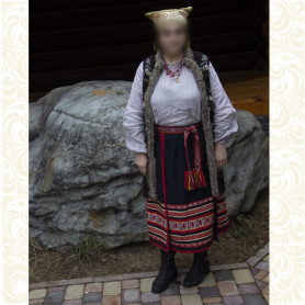 Юбка сшита из ажурного шитья, состоит из трех прямоугольных полотен, соединенных на поясе, украшена красным кружевом, бархоткой в тон, а также блестящей серебристой тесьмой.