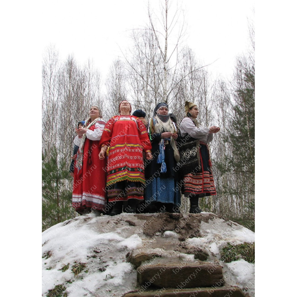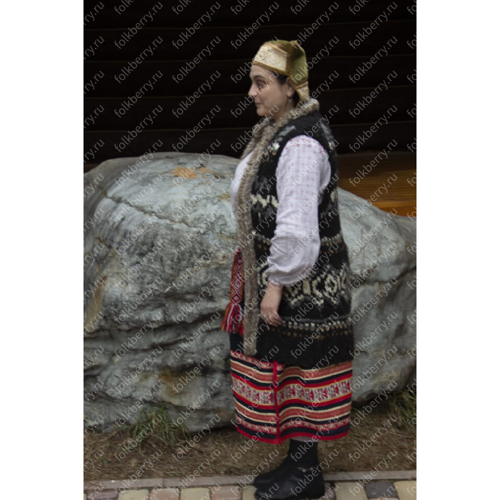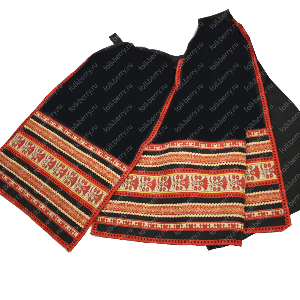 Характерное отличие поневы от любой другой юбки в том, что она обычно изготавливается из трех кусков ткани прямоугольной формы, собранных на общем поясе. Понева выполнена изо льна черного цвета. Каждая часть поневы декорирована жаккардовой тесьмой и вьюнами внизу и по примеру. Примечательно, что широкая тесьма с цветочным узором, выполнена на основе исторического изображения, см. фото. Как правило, поневу надевают на длинную рубаху и подпоясывают тканым славянским поясом или поясом-шнурком.