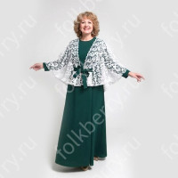 Костюм выполнен из габардина и красиво подобранного декора в золотистых цветах. Достоинства габардина в том, что он не мнется, не блестит, как атлас, ложится красивыми мягкими складками, цвет не выгорает. Юбка с оборкой, декор в золотистых цветах, по талии на двойной резинке. Блуза белого праздничного цвета, с баской, рукава расширены внизу, с манжетами. Сзади на блузе шнуровка. Она дает хорошую посадку по фигуре. Костюм предназначен для творческих сольных и коллективных театральных выступлений.