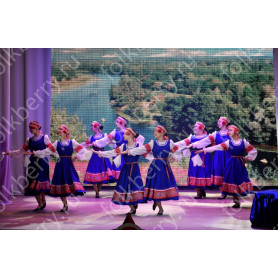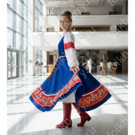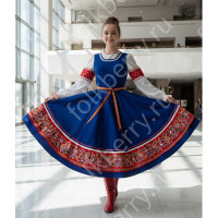 Костюм  выполнен из габардина и красиво подобранного декора в золотистых цветах. Достоинства габардина  в том, что он не мнется, не блестит, как атлас, ложится красивыми  мягкими складками, цвет не выгорает. Юбка  с оборкой, декор в золотистых цветах, по талии на  двойной резинке. Блуза  белого праздничного цвета, с баской,  рукава расширены внизу, с манжетами.   Сзади на блузе шнуровка. Она дает хорошую посадку по фигуре. Костюм предназначен для творческих  сольных и коллективных театральных выступлений.